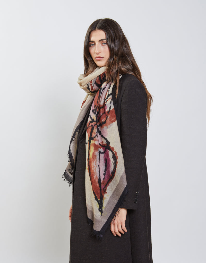 Il modello Dilaila è un capolavoro di eccellenza artigianale: il disegno floreale è relizzato con tecniche dipinte a mano come rullature e spugnature che rendono unico ogni pezzo. Le fibre di cashmere compongono la tela dell'opera d'arte indossabile.