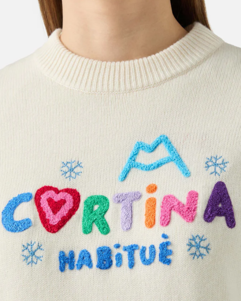 Giocoso e avvolgente, il maglione Danya cattura lo spirito gioioso delle fughe invernali. Realizzato in un filato misto morbido e caldo, presenta una divertente patch Cortina Habitué sul davanti, per un twist colorato e ironico ai look da freddo. La silhouette rilassata, il girocollo e i bordi a coste, insieme alla texture soffice, lo rendono tanto comodo quanto stiloso — perfetto per i momenti après-ski o i weekend casual in montagna.