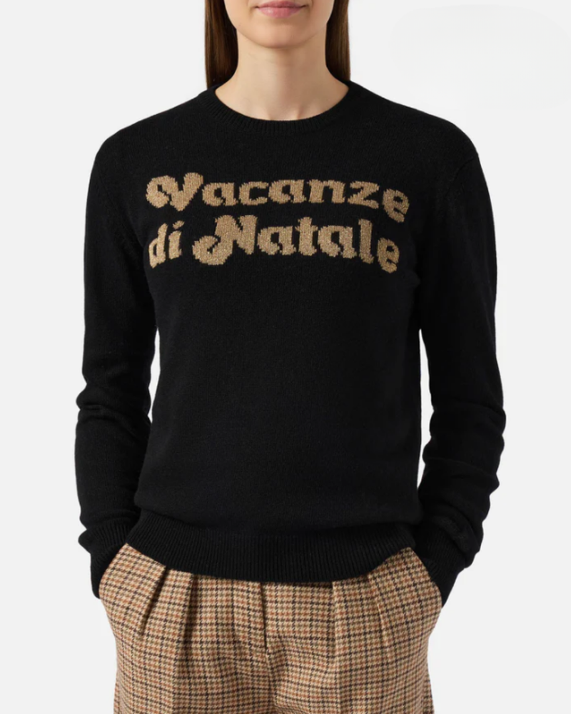 New Queen nero rende omaggio al cult dei Vanzina: jacquard lurex Vacanze di Natale per un mood festivo e urbano.