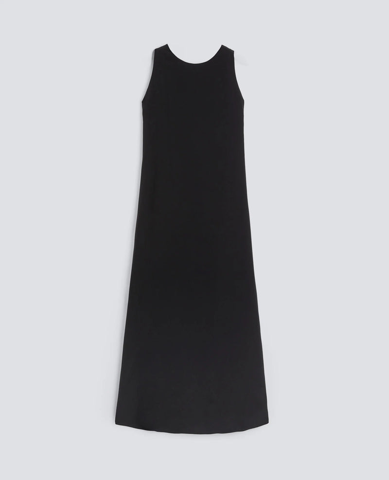 ABITO LUNGO IN CREPE DE CHINE SETA, LUNGHEZZA CM 140 FODERATO IN VISCOSA, SCOLLO ROTONDO A BARCHETTA ANTERIORE, CON SPALLINE POSTERIORI CHE SI INCROCIANO ANNODANDOSI IN UN FIOCCO, SENZA MANICHE, CORPO LEGGERMENTE SVASATO, VESTIBILITA' REGOLARE.