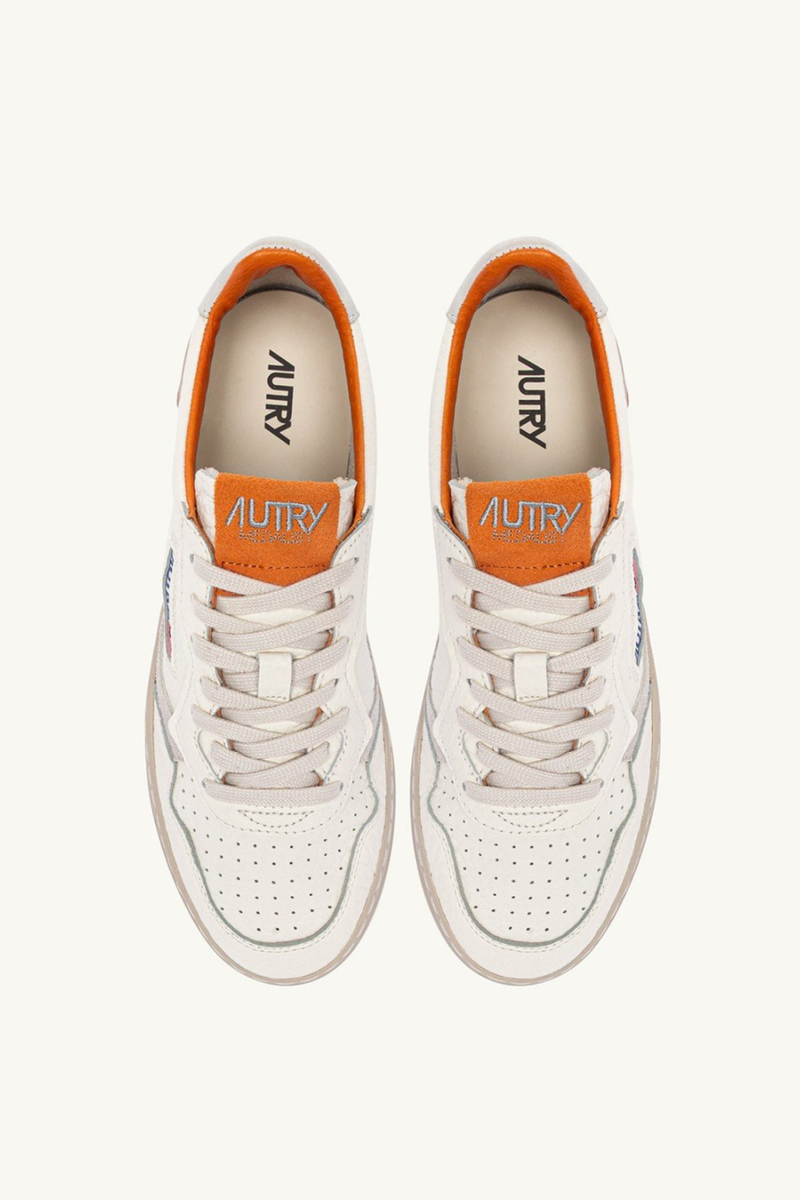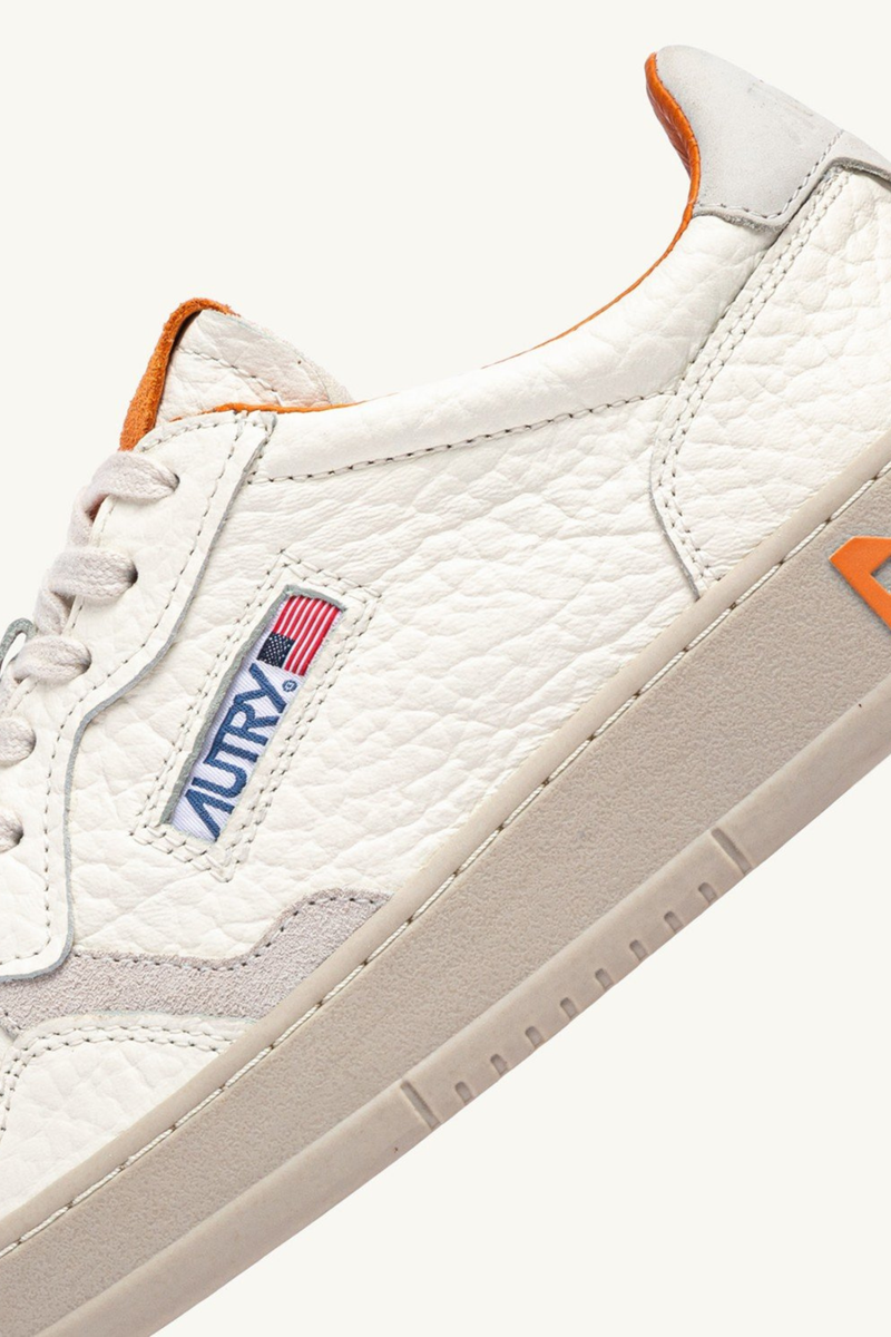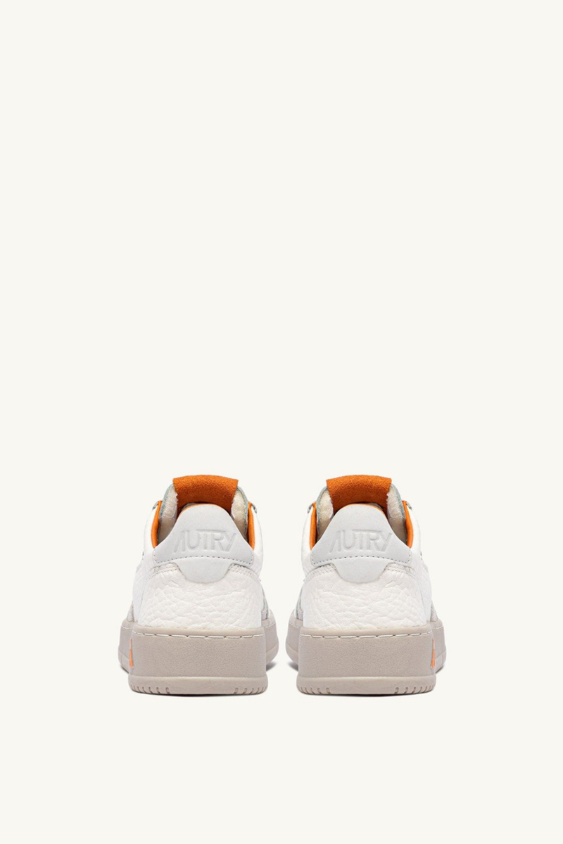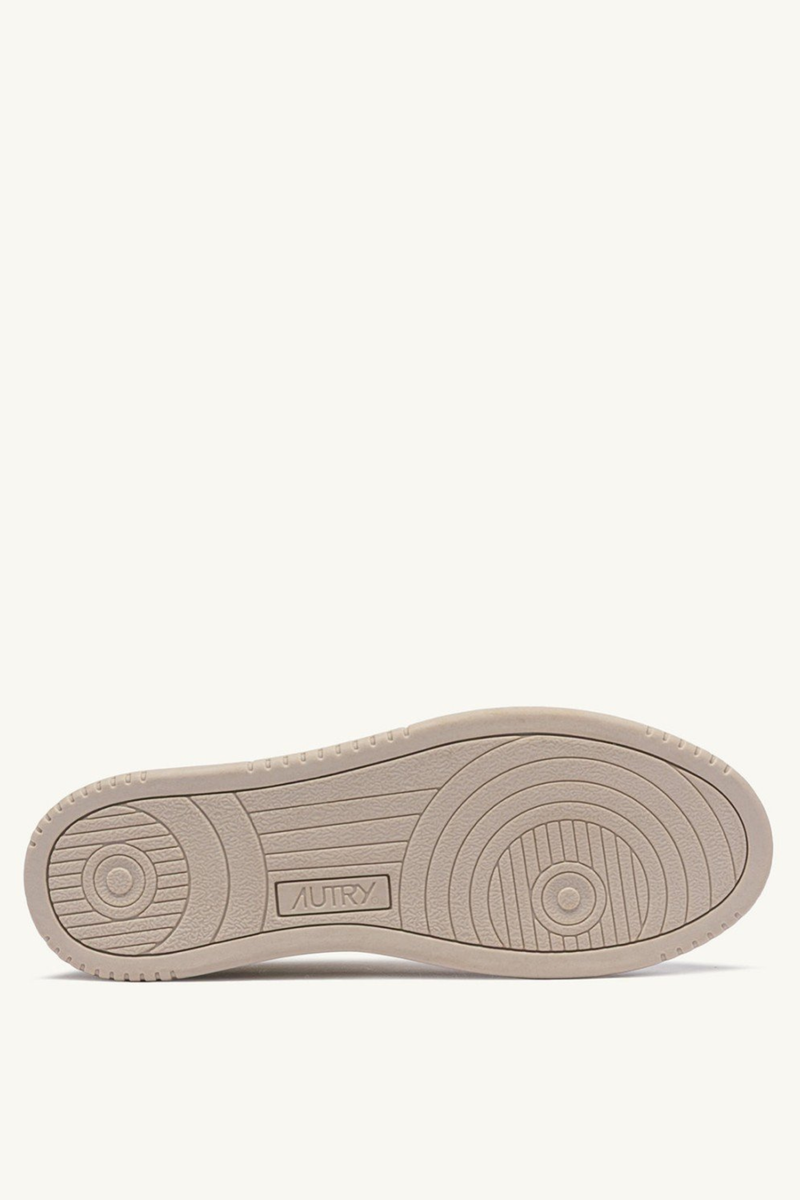 Il dettaglio logato in nabuk avorio sul tallone, l'inserto laterale con logo Autry jacquard e la suola leggermente più scura personalizzano il look.