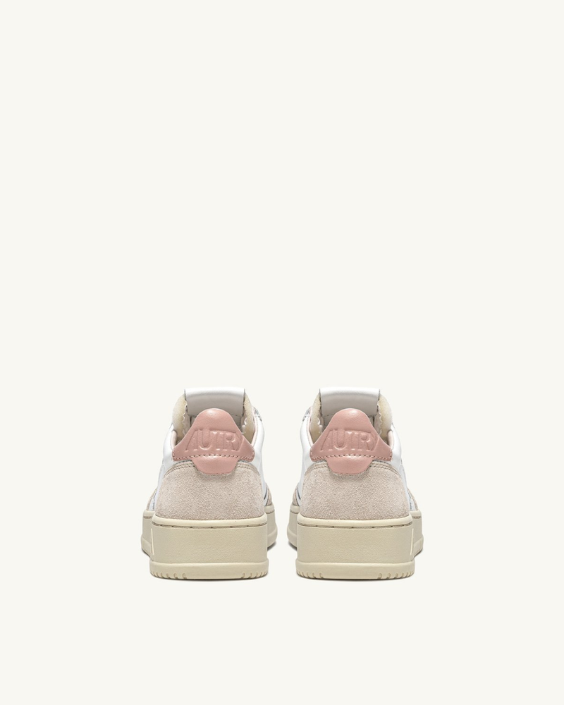 Questa scarpa da ginnastica da donna è realizzata in morbida pelle bianca dall'aspetto autentico ed è rifinita con rinforzi in suede beige per un mix tattile e grafico deciso. Il dettaglio in pelle rosa che decora il tallone è personalizzato con il logo Autry.