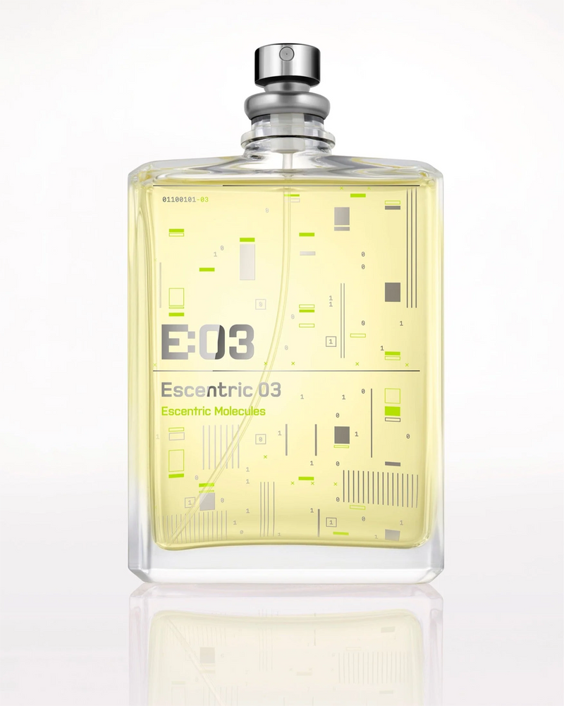 Escentric 03 100 ml è incentrato sull'acetato di vetiverile in una formula che rende omaggio alle tre radici utilizzate in profumeria: vetiver, zenzero e iris. "Volevo che Escentric 03 esaltasse le sensazioni olfattive di queste radici e mostrasse come si armonizzano tra loro", afferma Geza Schoen.
