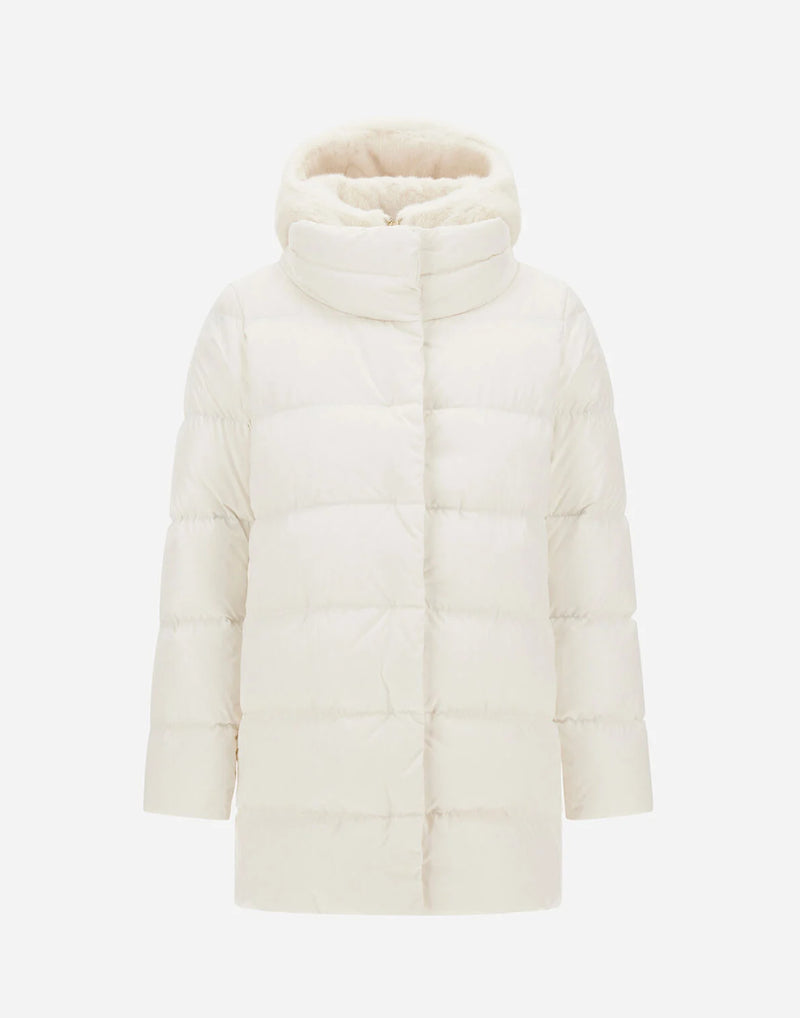 La linea elegante del capo viene valorizzata dalla pettorina rimovibile con cappuccio, rifinita in pelliccia sintetica effetto castorino.