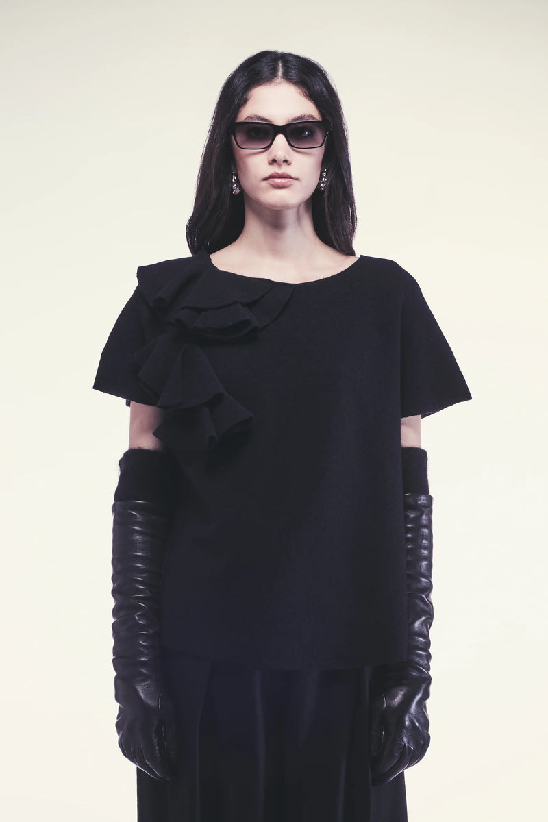 MAGLIA A MANICHE CORTE IN LANA INFELTRITA, LUNGA FINO AL BACINO. DETTAGLIO CON VOLANT ARCHITETTONICI POSIZIONATO SUL LATO DESTRO DEL CAPO.