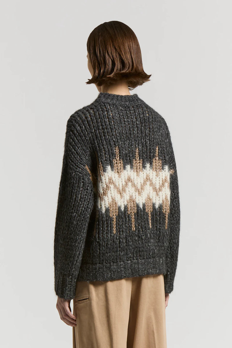 Il disegno a motivi geometrici di stile norvegese è realizzato con la tecnica jacquard.