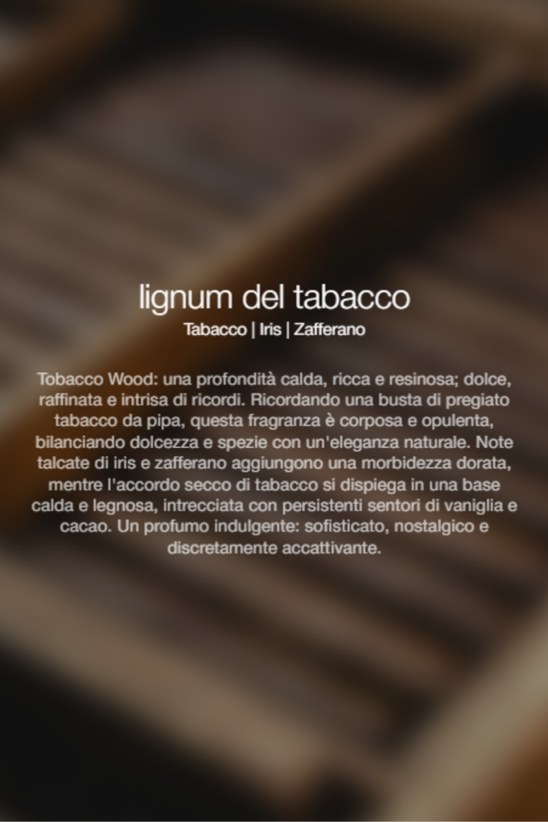 Legno di tabacco: una profondità calda, ricca e resinosa; dolce, raffinata e intrisa di ricordi.